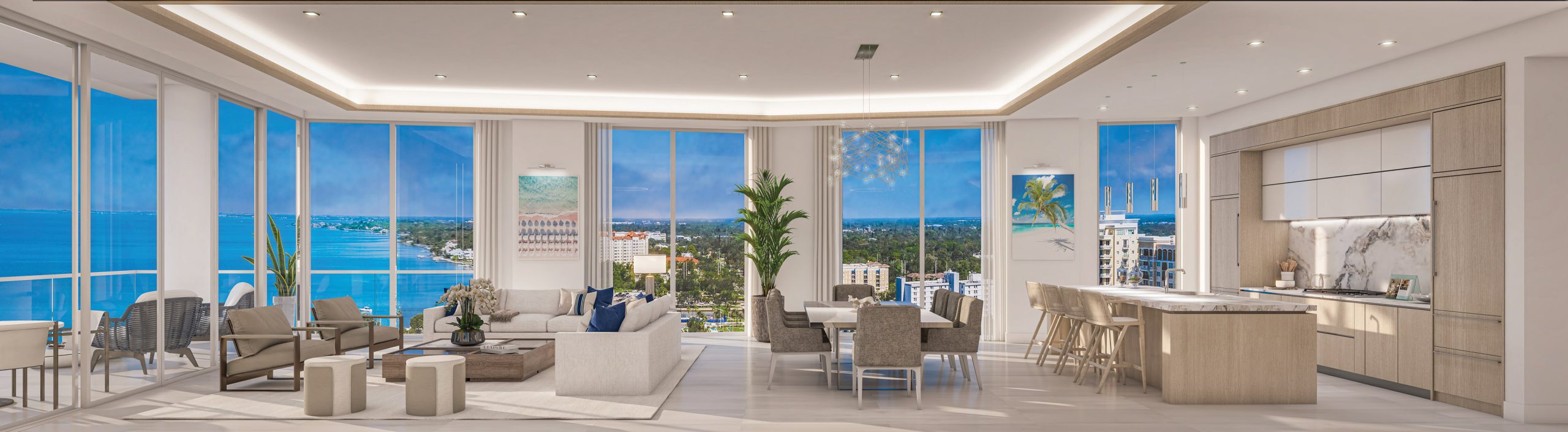 Residence E is thoughtfully designed to optimize the stunning vistas from the north end of the tower. Its impressive design features soaring walls of glass that create an expansive and luxurious Great Room experience. This spacious area is accentuated by a wraparound terrace with a summer kitchen, providing panoramic views of the Harbor and Sarasota Bay. The primary bedroom offers a breathtaking bay view through dramatic, oversized windows, complemented by two generous walk-in closets. The spa-style bathroom boasts a deep soaking bathtub, a double shower, and a double vanity. Additionally, two guest bedrooms each come with private ensuite baths and access to a separate east-facing wraparound terrace.